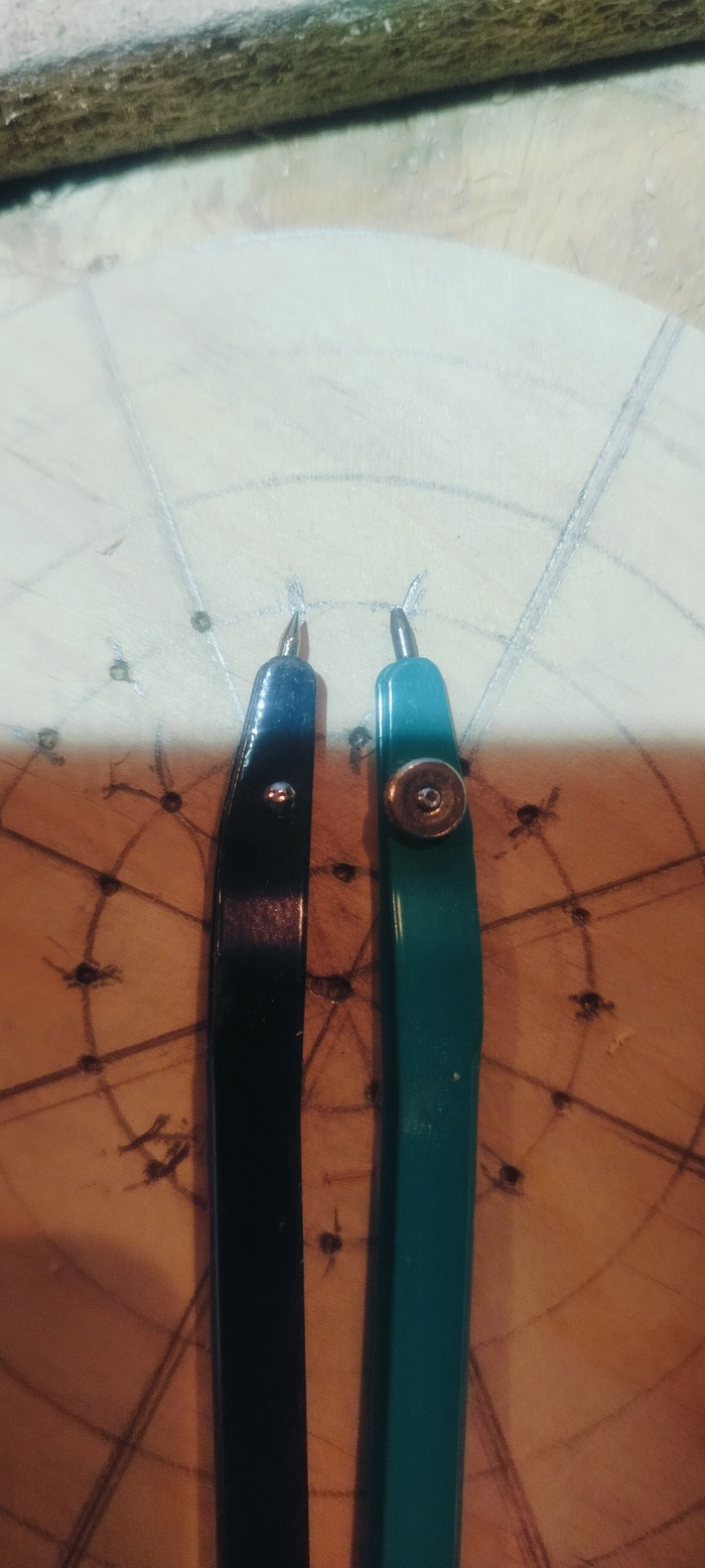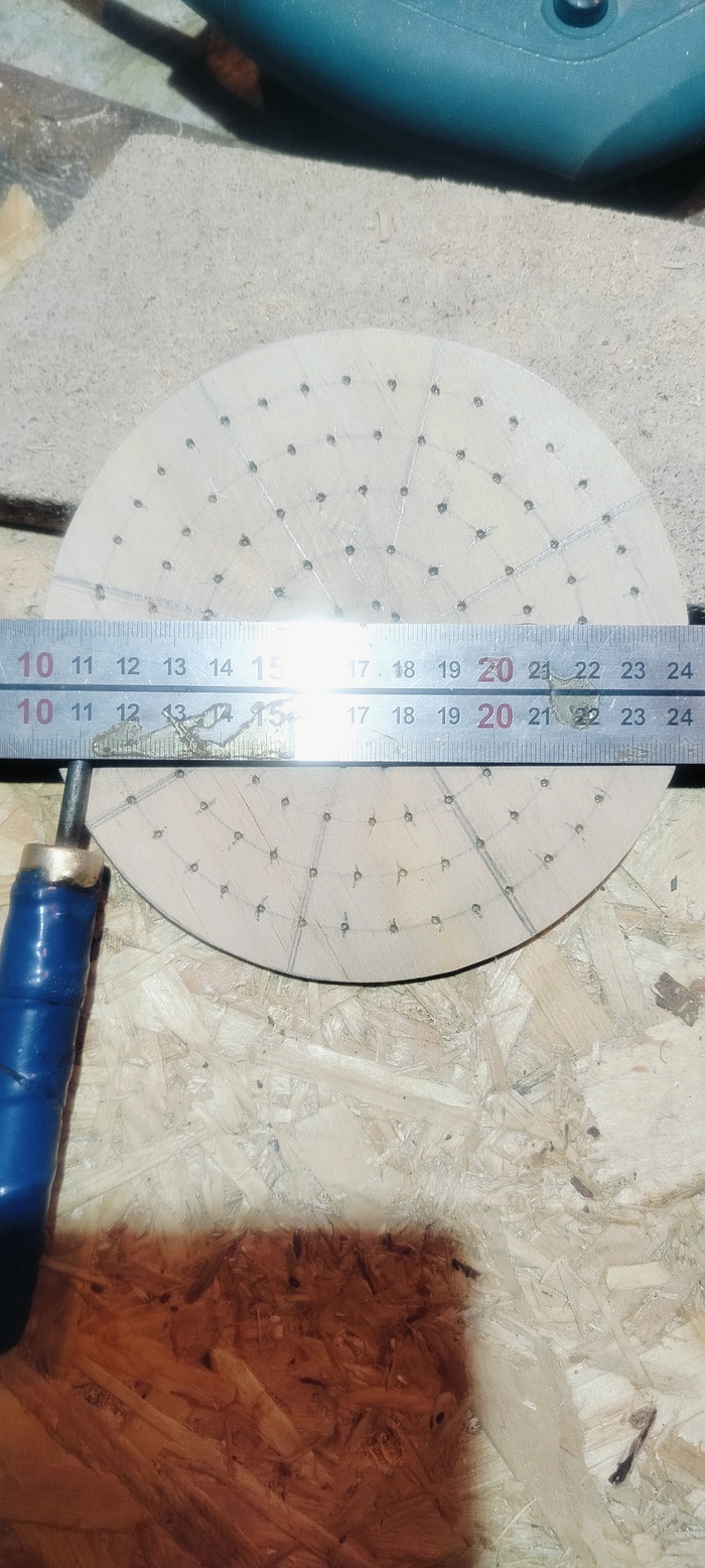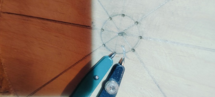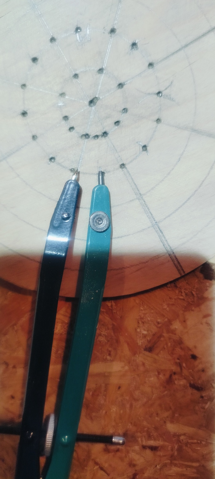 Тут немного по другому. Хотя лента у меня не калиброванная ( уже –шире), исхожу из того, что она равна 4 мм, по ширине ( делаю вид, что она одинаковая по всей длине). Поэтому первая окружность будет радиусом 12 мм. Если бы принимал за дано, что лента шириной 3мм, то первая окружность была бы радиусом 9 мм. Отмечаю шилом точки пересечения. Так будет удобнее сверлить , да и зрение у меня к концу дня не очень. Так хоть пальцем нащупать можно.