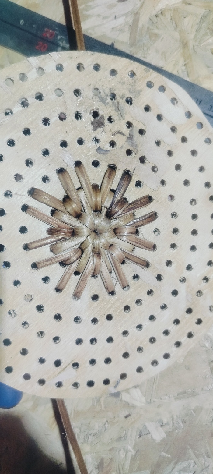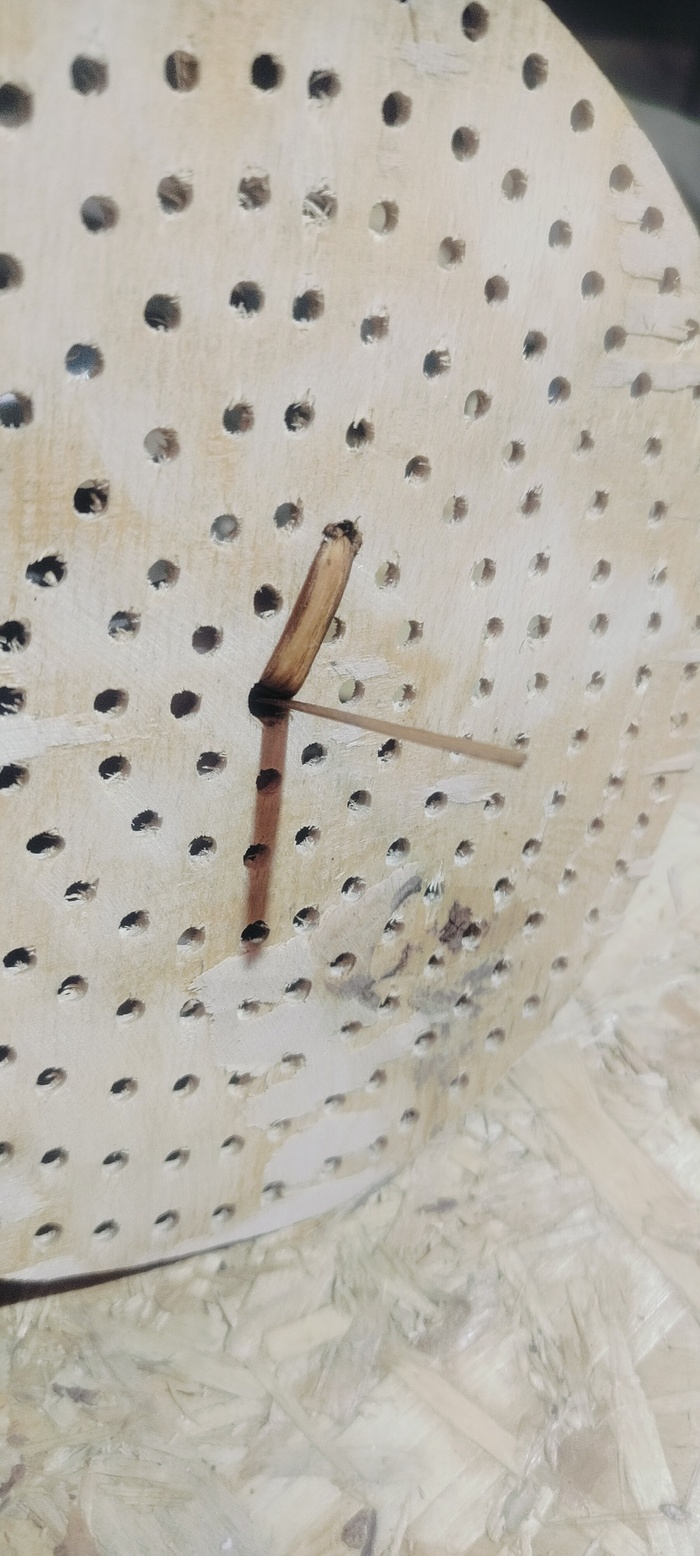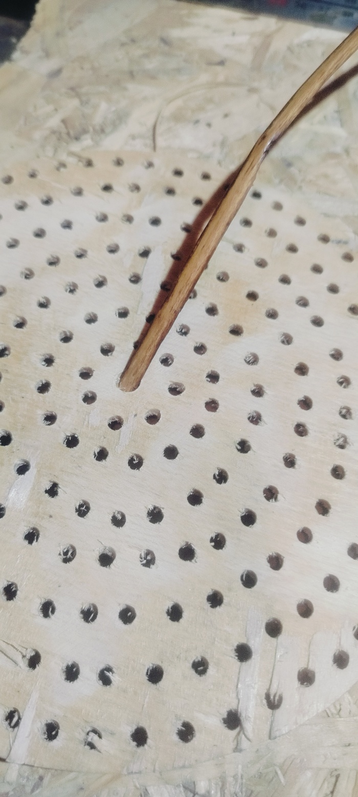 Счистил ножом верхний шпон, иначе он сам отвалится. Отверстия 4 мм, центральное 6 мм. Подготовка : Ремесло. Из старой фанеры . Буду делать двумя цветами, чтобы лучше было видно.