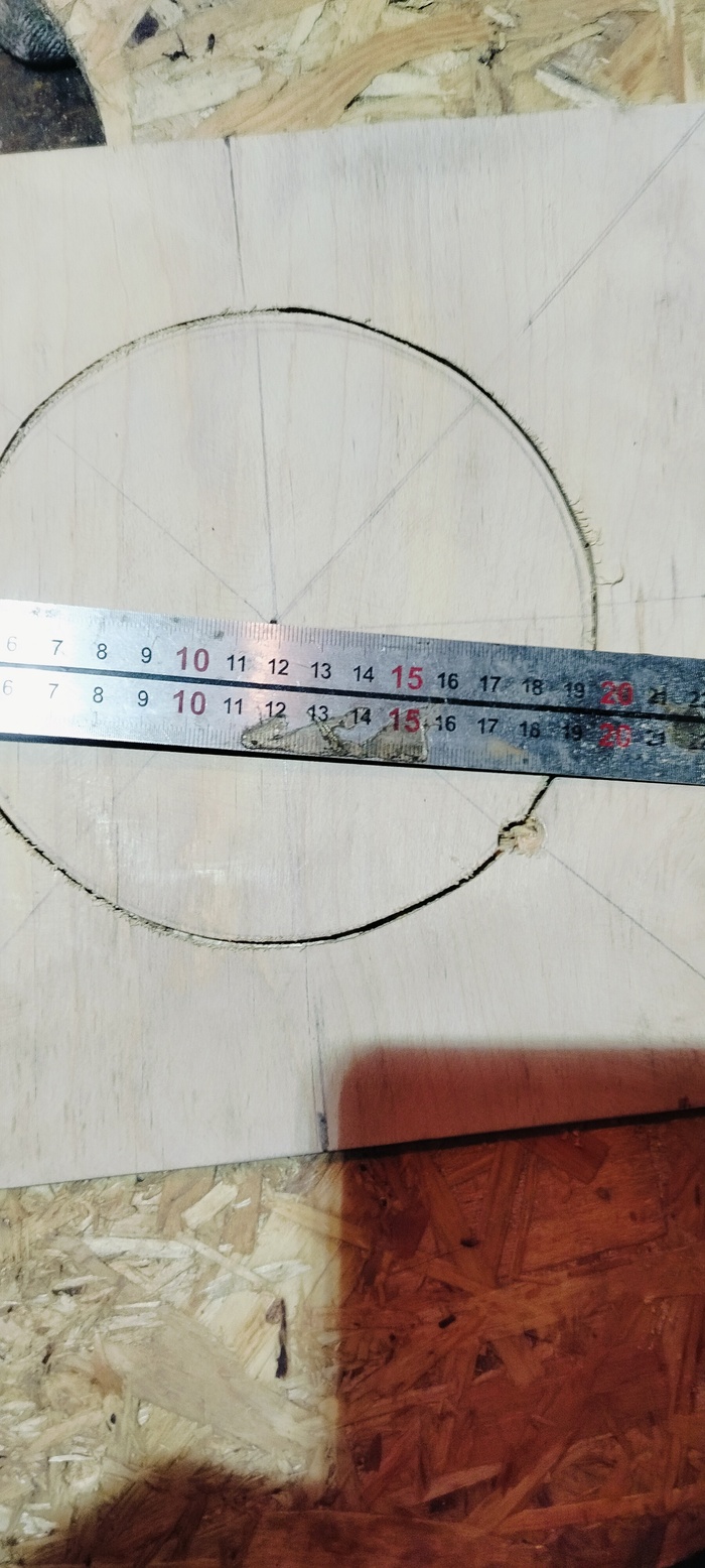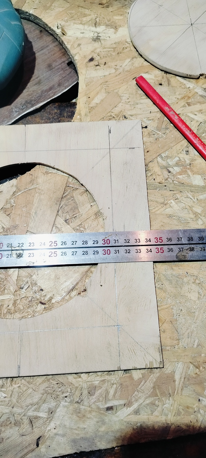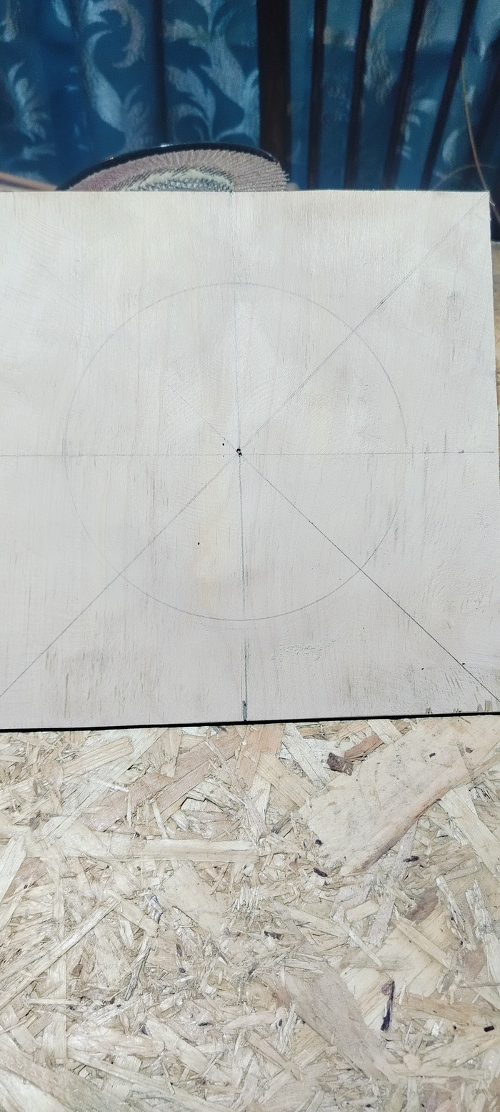 Делаем разметку. Рисую диагонали. Размечаю серединку каждой стороны, провожу линии. Всё должно совпасть в центре. Чертим круг произвольного диаметра. Исхожу из размеров фанеры, чтобы получить два шаблона. Поэтому круг получается около 16 см.