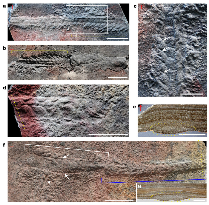 Рис. 3. Ископаемые экземпляры (body fossils) и следы ползания Y. spiciformis. a–c — голотип: a — выпуклая поверхность спинной стороны, b — вдавленный противоотпечаток того же экземпляра (по желтым скобкам можно проследить соответствие между a и b), c — увеличенный участок, обведенный белой рамкой на изображении a, стрелками отмечены едва заметные складочки, которые, возможно, говорят о том, что боковые лопасти сегментов были членистыми, подобно конечностям артропод (но авторы в этом не уверены); d — задний конец тела; e — поперечный срез того же образца по линии, показанной пунктиром на рисунке d (на рисунке e обведено распиленное поперек пухленькое тело ископаемого животного); f — «след смерти» (mortichnium), то есть след ползания (белая скобка), в конце которого сохранилось само ископаемое животное (синяя скобка), большими белыми стрелками показаны бороздки по краям следа илинии, маленькая стрелка отмечает след ползания какого-то мелкого существа, пересеченный илинией перед смертью; g — поперечный срез того же образца. Длины масштабных отрезков: 2 см (a, b, d), 1 см (c, e), 5 см (f), 0,5 см (g). Изображение из обсуждаемой статьи в Nature