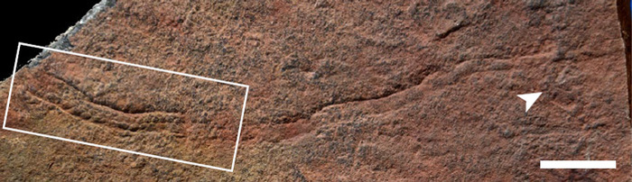 Рис. 4. След ползания илинии, в левой части которого можно разглядеть отпечатки сегментов. Образец представляет собой противоотпечаток, поэтому валики выглядят как бороздки. Изображение из обсуждаемой статьи в Nature