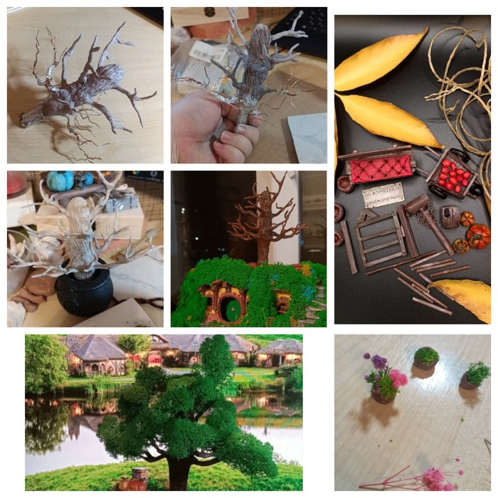 Материал: полимерная глина, самозатвердевающая глина, дерево, картон, мох стабилизированный, деревянные палочки, проволка, акрил, грунт, нитки, мелкие цветы.