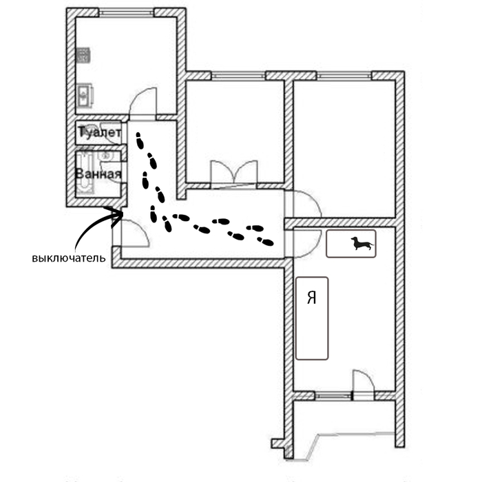 Большой диван стоял вдоль стены, а дверь в комнату была в одном метре слева. Напротив двери стоял маленький диван, на нем любил лежать пес. Так он мог одновременно контролировать что происходит в комнате и в коридоре. Ведь, если кто то пойдет на кухню, важно не упустить момент.