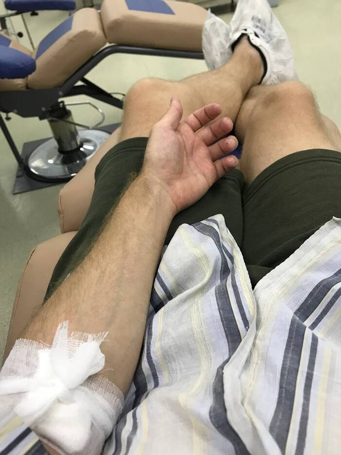 Где-то после четырех часов процедуры у меня начали неметь пальцы на руках, ну и что - подумал я и спокойно сидел себе дальше, затем у меня онемели руки по локоть и начали неметь пальцы на ногах. Я подумал, что это странно. Но не буду же я тут по таким пустякам беспокоить медсестру или врача, в конце концов… Я сидел, тело быстро становилось тяжелым, пытался тихонько разминать руки-ноги, не привлекая внимания. Медсестра заметила мою возню, посмотрев мне на руки, попросила пошевелить пальцами и тут я понял, что не могу ими двигать, впрочем как и говорить, меня буквально впечатало в кресло… Медсестра тут же вызвала доктора, параллельно начав мне в катетер ставить какие-то препараты (как потом оказалось антикоагулянты), врач пришел меня осмотрел, задал риторический вопрос - почему я не сказал ничего о своем самочувствии. После препаратов начало отпускать, я смог говорить, стало тепло) Врач спросил продолжаем ли мы процедуру, я, конечно, согласился. Сказал, что у меня давно уже немели руки, но я не посчитал эту информацию стоящей внимания, меня пожурили. Сказали в любом случае ничего страшного бы не случилось, дискомфорт я создал только себе. Онемение это нормально и об этом надо сразу сообщать, тогда мне подколят препарат и будет ок. В итоге я досидел все 6 часов, врач с медсестрой уже постоянно были рядом. И меня отпустили гулять. Предложили написать письмо реципиенту. Я написал.