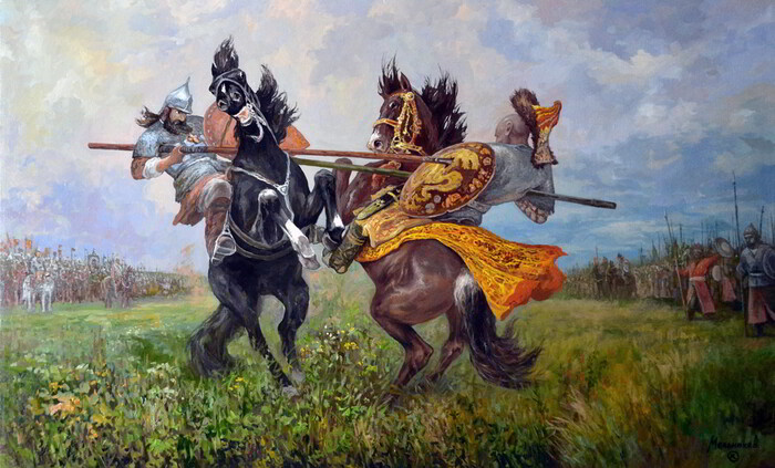 Первым в бою погибает Пересвет, но, одновременно, поражает своего противника - Кочубея. Его подвиг, ценой собственной жизни, становится предтечей победы. Это вдохновляет войска Донского на самое яростное сражение.
