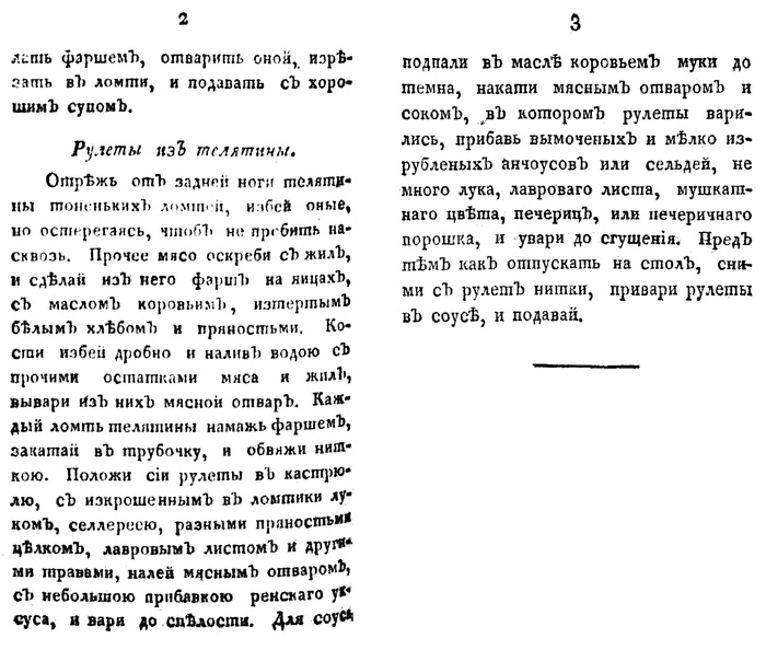 "Отрежь от задней ноги телятины тоненьких ломтей, отбей их, но остерегись, чтобы не пробить насквозь. Прочее мясо соскреби с жил и сделай из него фарш на яйцах, со сливочным маслом, истертым белым хлебом (имеются в виду сухари скорее всего или хлебные крошки) и пряностями. Кости поруби на куски и залей водою с прочими остатками мяса и жил, вывари из этого всего мясной отвар. Каждый отбитый ломоть телятины намажь фаршем, скатай в трубочку, и обвяжи ниткой. Положи эти рулетики в кастрюлю с покрошенным ломтиками луком, сельдереем, разными пряностями целиком, лавровым листом и другими травами, залей мясным отваром с небольшой добавкой винного уксуса, и вари до готовности.