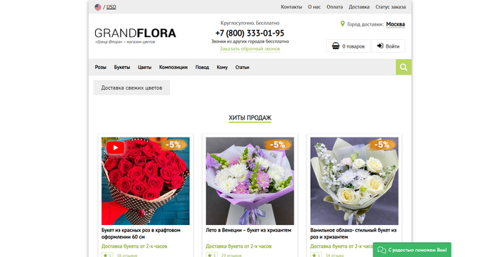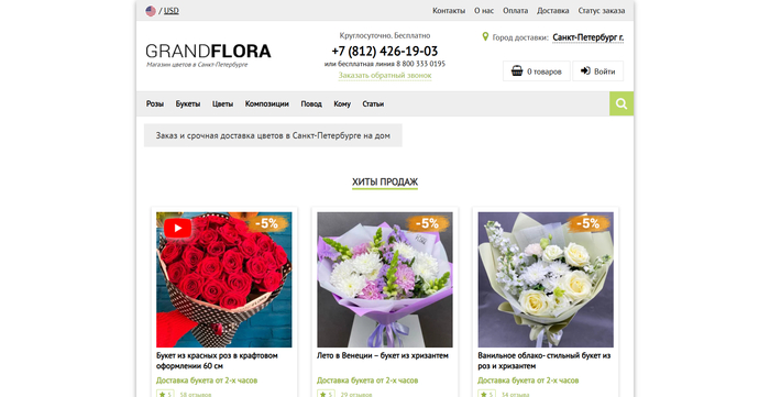 Grand-Flora – интернет-магазин, специализирующийся на доставке цветов и композиций по всей России. Основанный с миссией сделать покупку и доставку букетов максимально комфортной для клиентов, сервис предлагает широкий спектр флористических решений на любой случай. Вебсайт компании отличается интуитивно понятной навигацией и элегантным дизайном, что делает процесс заказа быстрым и удобным. Клиенты могут выбрать из обширного каталога букетов и композиций, а также воспользоваться услугой индивидуального подбора букета. Товары на платформе обновляются регулярно, обеспечивая свежесть и актуальность предложений. Кроме того, компания предлагает доставку в заранее указанное время, что позволяет клиентам планировать торжественные мероприятия без лишних хлопот. Пользователи отмечают высокий уровень обслуживания и профессионализм флористов Grand-Flora.