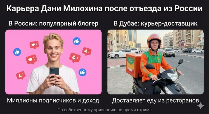 Уехавший из России в Дубай блогер Даня Милохин работает курьером - доставляет еду.