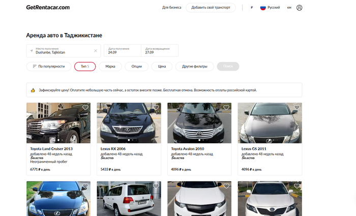 ▶️ GetRentacar — найдите выгодные авто у локальных прокатчиков, бронируйте без предоплаты и оплачивайте в удобной валюте в Душанбе.