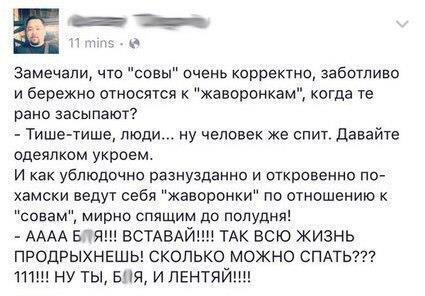 И еще. Всю жизнь жаворонки мне говорят что я неправильная, что надо просто перебороть. 30 лет перебарывала, смысл мучить себя?! Люди разные! И если совы толерантны, ночью стараются быть потише, то жаворонки просто чинят беспредел!