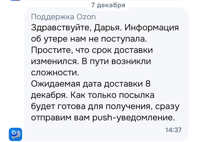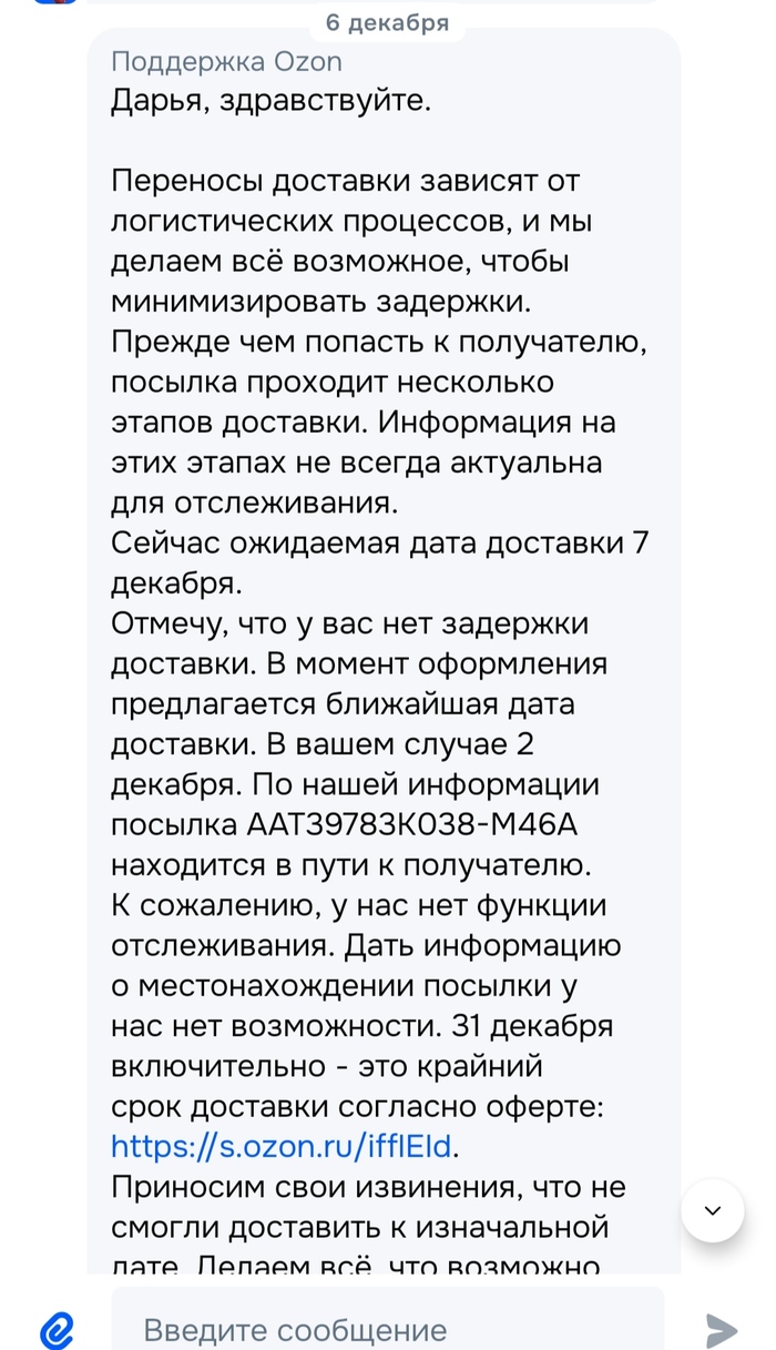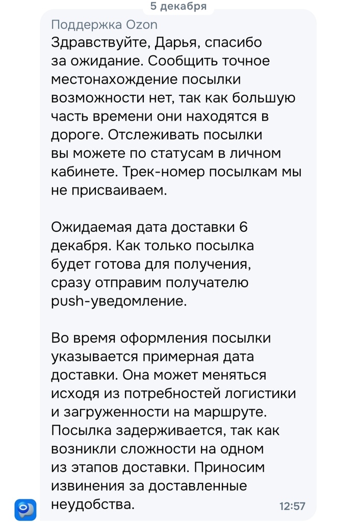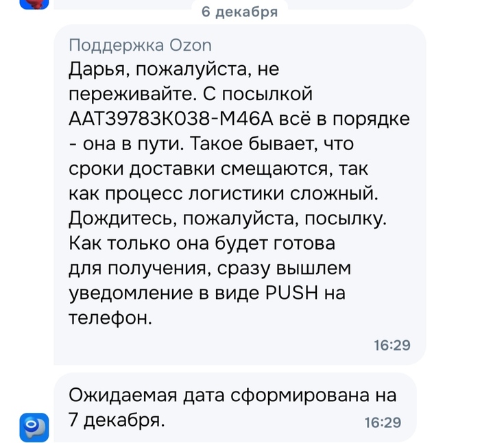 @Ozon, может поможете посмотреть, где посылка AAT39783K038-M46A? Поддержка ничего не поддерживает.
