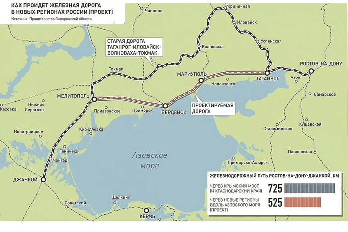 Восстанавливать магистраль и строить новую ветку вдоль Азовского моря начали в сентябре 2023 года. На первом этапе проложили 63 км и восстановили 140 км путей. Предстоит завершить еще два этапа: прокладку тупиков и развязок для трасс, построить помещения для дежурных на станциях и другие работы.