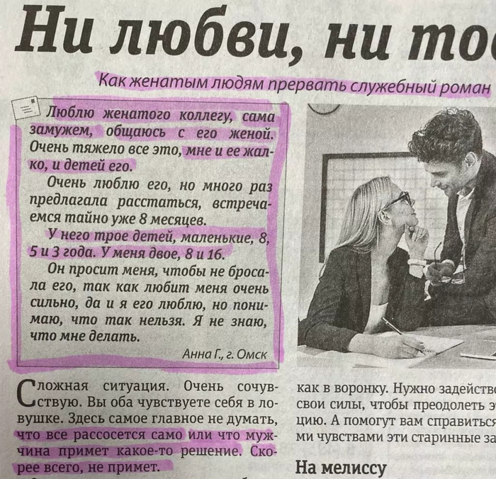 И вот, вы красивы, он тоже ничего…но на пути встал служебный роман… у него 3 детей, у вас 2… как быть? Брать инициативу на себя, ведь он (как говорится в журнале), никогда не примет решение сам.
