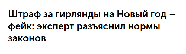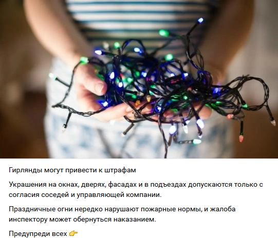 Это не так. Председатель правления Союза жилищных организаций и член комитета по ЖКХ Торгово-промышленной палаты России опроверг «новогодние штрафы»: «Никаких согласий, собраний для того, чтобы украшать гирляндами подъезд или фасад, не требуется. Соответственно, никаких штрафов за это нет».