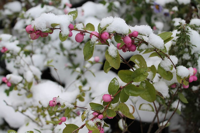 Плоды начинают формироваться ближе к осени и удерживаются на кусте до поздней зимы. Именно в это время куст наряжается в свою белоснежную «бижутерию» — плотные округлые ягоды, по цвету напоминающие жемчуг или белый воск. У некоторых сортов они бывают нежно-розовыми или малиновыми, и в этом случае снежноягодник превращается в настоящее украшение сада.
