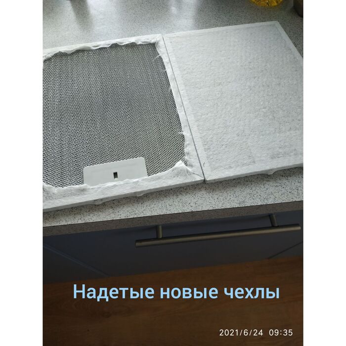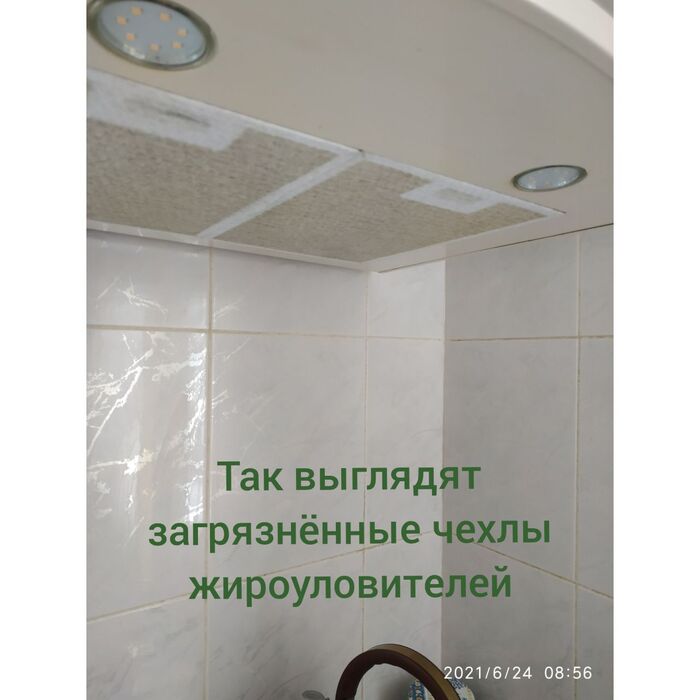 Меняются чехлы по факту загрязнения, материал вискоза, покупаем в обычном магазине. Используем у себя дома в течение уже двух лет, жироуловители как новые, вытяжка работает прекрасно!