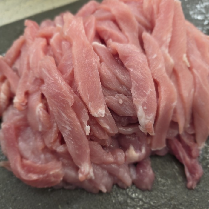 Свинину (лучше слегка подмороженную) нарезать тонкими полосками ну или так называемой соломкой.