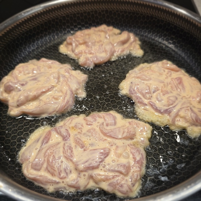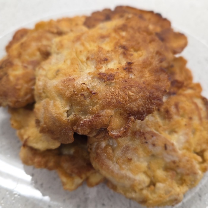 Через 10-12 часов вытащить миску из холодильника, сновая перемешать и пожарить как оладьи на растительном масле до румяности. Некоторые спросят - сколько-сколько часов? Ну, я проверил и пожарил часть через 5 часов и часть на следующее утро. Докладываю: более длительная выдержка улучшает текстуру и вкус прям значительно.
