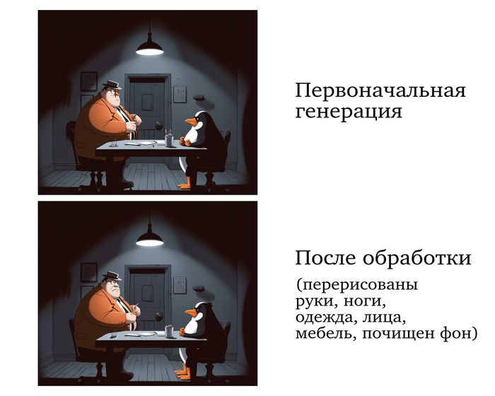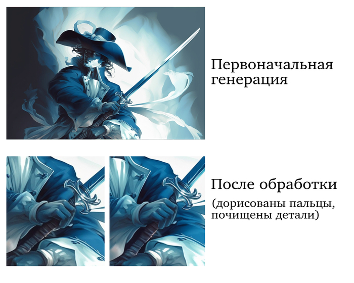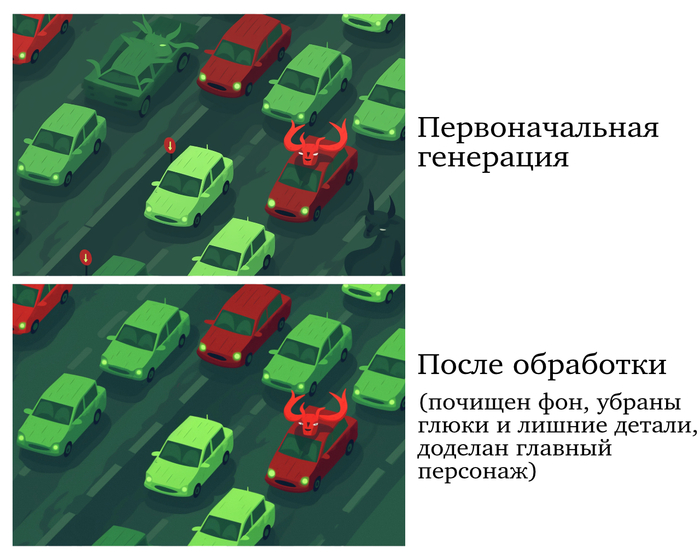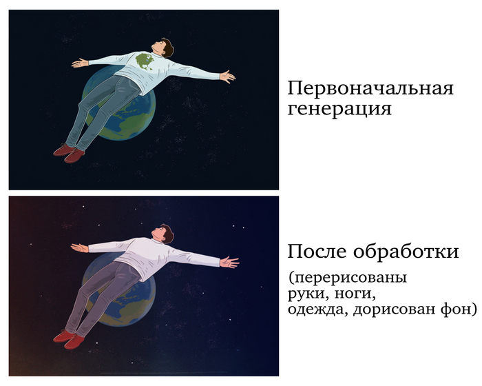 Некоторые картинки я редактирую не для того, чтобы убрать ошибки, а чтобы добиться нужного впечатления. Разумеется, нейросеть пока не может смоделировать нужный эффект от иллюстрации.