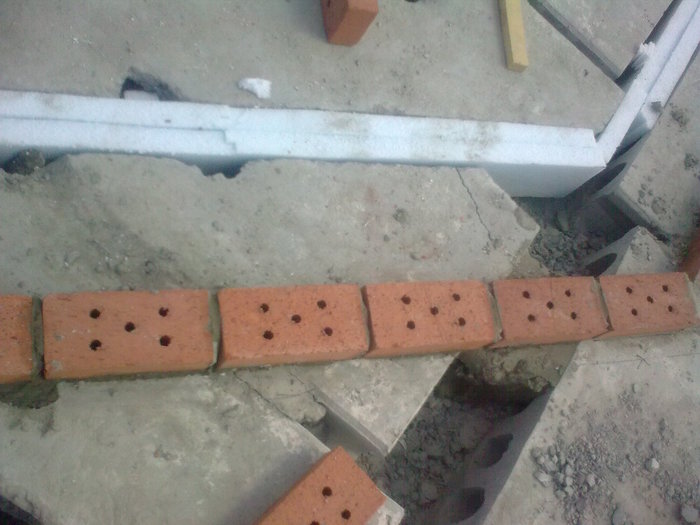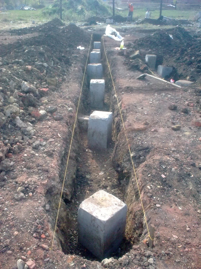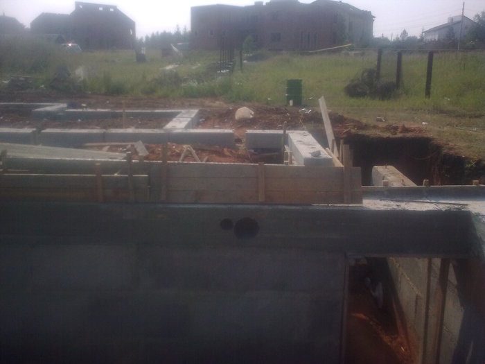 Ростверк практически без опалубки в грунте исполнен. По прикидкам уровня дороги и слухам о ее поднятии поверх ростверка воткнули стеновые блоки 300 мм высотой.