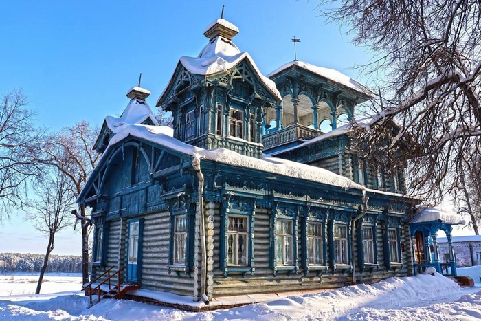Дом сразу привлекает внимание богатой архитектурой: резные наличники, карнизы и деревянные башенки с террасой формируют узнаваемый, почти сказочный облик. Усадебный комплекс включал и хозяйственные постройки, соединённые с главным домом тесовым переходом, который до наших дней не сохранился.