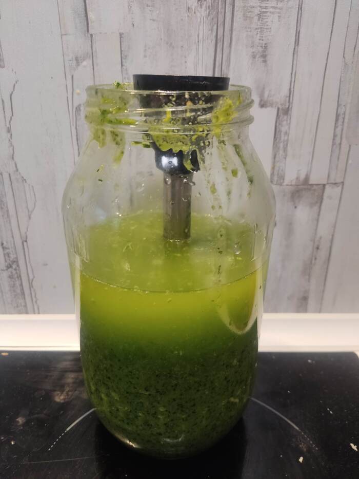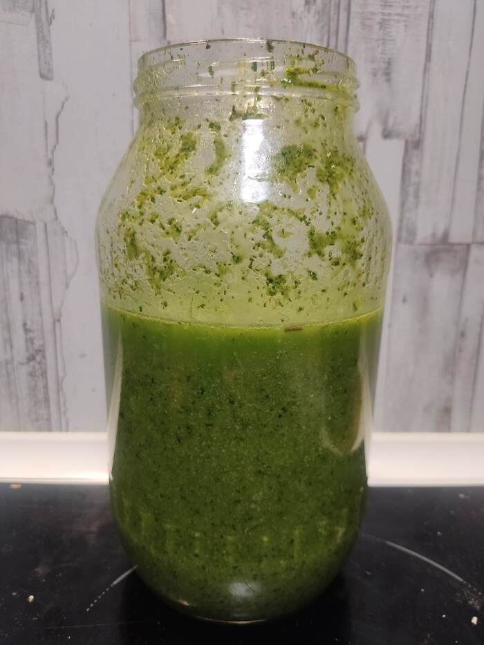 Масла можно добавлять немного, около 150-200 мл, тогда получится прекрасный соус или заправка. Я лью 500-700 мл..масло впитывает ароматы трав, гуща остаётся на дне, можно процедить, можно оставить как есть и ароматное масло черпать столовой ложкой с поверхности, а заправку брать со дна.