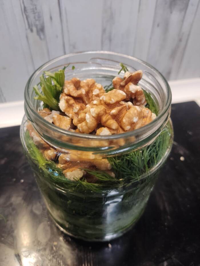 Укроп, петрушка, грецкие орехи, чеснок, подсолнечное масло, специи.