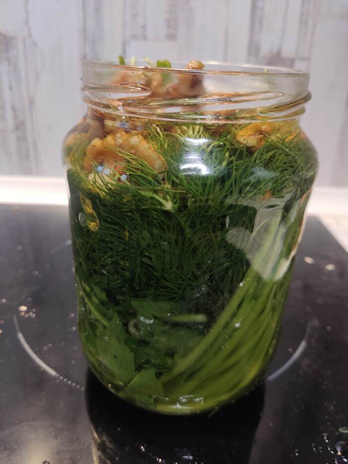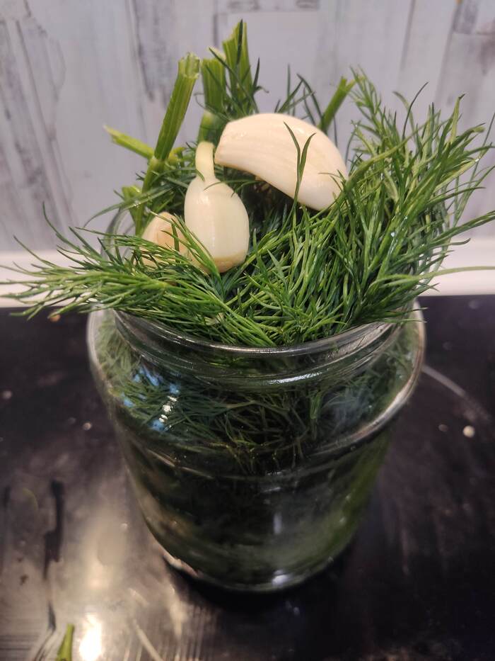 Укроп и петрушку примерно по 50-70 гр вместе со стеблями закидываем в банку. Стебли имеют такой же потрясающий аромат, а блендером перебьются - и не будут ощущаться.