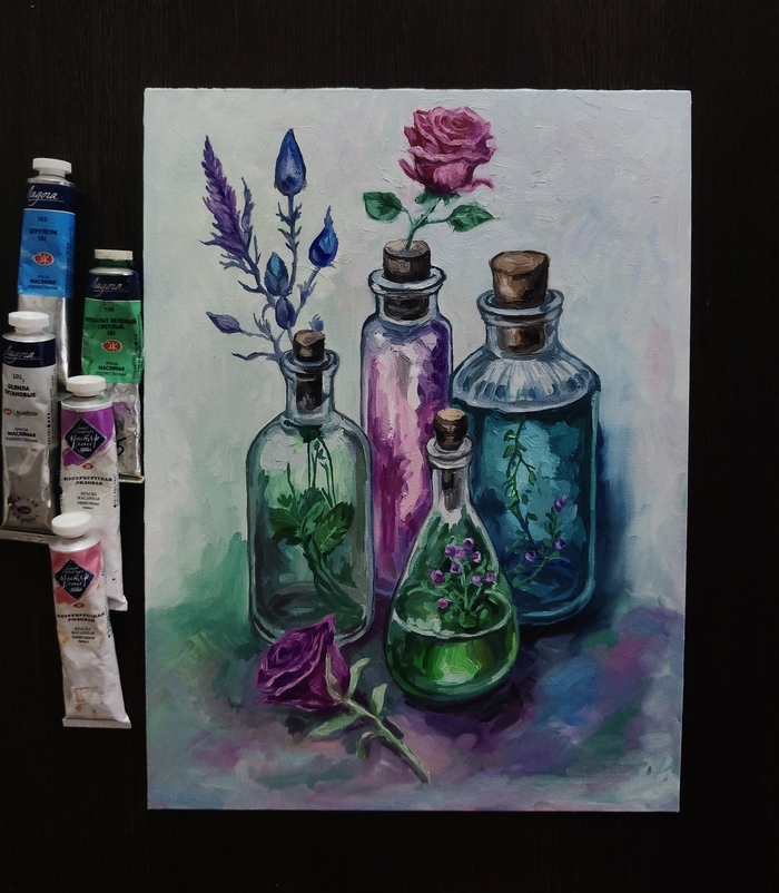 Маленькая магия на холсте! Стеклянные баночки с светящимися зельями — от лилового эликсира страсти до изумрудного напитка мудрости.💖