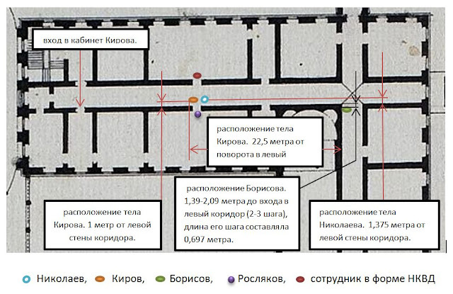 Из протокола патаналогоанатомического исследования ранения Кирова [15] можно восстановить детали убийства. Во-первых, ранение было «слепым», то есть пуля вошла в затылочную часть черепа и там остановилась, нанеся серьёзные повреждения головному мозгу не совместимые с жизнью. Киров умер мгновенно. Во-вторых, пуля, войдя в голову Кирова, столкнулась на излёте с костной тканью левой лобной части черепа Кирова, но пробить её не смогла из-за потери своей кинетической энергии, однако, ослабила прочность кости. Поэтому от падения на твёрдый пол Смольного в черепной коробке убитого образовались трещины, которые распространились от лобной части головы по направлению к задней затылочной её части, а на лбу образовалась гематома (кровоподтёк). Медицинской экспертизой установлено, что от удара головы о твёрдую поверхность пола пуля изменила своё положение в ране. Она развернулась в раневом канале на 180°, и, скользя обратно по нему, перекрыла входное пулевое отверстие, в связи с чем, предотвратила обильное вытекание крови из раны. Именно поэтому не были обнаружены кровавые следы на месте убийства Кирова. И вполне логично, что перепуганные сотрудники Смольного, не увидев крови, пришли к выводу, что первый секретарь партийной организации города Ленинграда жив, он просто контужен и потерял сознание. Они унесли тело с места преступления в личный кабинет Кирова, чтобы там ему была оказана первая помощь силами медицинского персонала Смольного. Несколько человек, оставшихся у тела Николаева, привели его в чувство и увели с места убийства в один из кабинетов третьего этажа здания, обеспечив его охрану до прибытия представителей органов НКВД. Когда прибыли сотрудники этой организации каких-либо следов на месте преступления естественно не было. Именно по этой причине не существует схемы места убийства Кирова, и искать её в засекреченных архивах следственного дела не имеет смысла. Представителям НКВД были переданы револьвер «Наган», обнаруженный на месте преступления, документы задержанного и собственно Николаев, находящийся в тот момент времени в полном ступоре, то есть в невменяемом состоянии. В-третьих, пуля вошла в затылок Кирова по направлению снизу вверх. Рост Кирова 168 сантиметров, рост Николаева 150 сантиметров. Это указывает на то, что стрелял Николаев. И последний четвёртый вывод. Пуля вошла в затылочную часть черепа Кирова сзади справа налево под углом около 30° в горизонтальной проекции. А это доказывает, что в момент выстрела Николаев находился по отношению к Кирову за его спиной и правее от него в направлении к центру малого коридора.