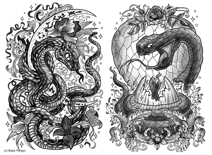 Очень люблю рисовать змей. Прямо очень) У них какая-то понятная моему мозгу анатомия, не то что человеческая) Первая картинка - просто фантазия на тему Луны и Змеи, как символов. Вторая называется "Змеедитятко".