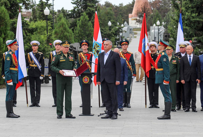 Под гимн России Дворников передал грамоты и исторические справки о боевом пути воинских частей губернатору Севастополя Михаилу Развозжаеву и главе Крыма Сергею Аксенову.