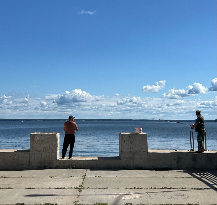 Несмотря на то, что людей не очень много, набережная выглядит достаточно живой – различные беседки, лавочки, фонари. Периодически, на пожарных съездах к воде попадаются рыбаки. Володя даже задержался рядом с такими и немного пообщался.