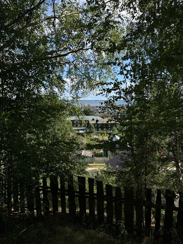 Решил-таки забраться на одну из горок. Вроде по описанию, откуда-то была хорошая видимость на воду – то ли с Пушкарихи, то ли с Бабьего пупка. По итогу нет. Все поросло. Еще и собака облаяла на спуске. Правда я ожидал увидеть их в большем количестве, все-таки размашистый частный сектор. Хотя бы это радовало.