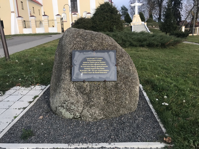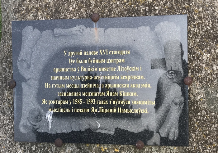 И действительно – оказывается, в 16 веке идеи арианства приняли широкое распространение в этой местности, в Ивье была даже первая в Белоруссии типография, и была академия ариан – да и вообще, здесь был крупный центр, известный и в Польском королевстве, и в Великом княжестве Литовском. Это происходило во времена Яна Кишки, крупного польского магната, но совершенно непонятно, кому потребовалось устанавливать памятную плиту относительно недавно. Во всяком случае, у нас в России такое и в голову бы никому не пришло, вспоминать официально признанных еретиков.