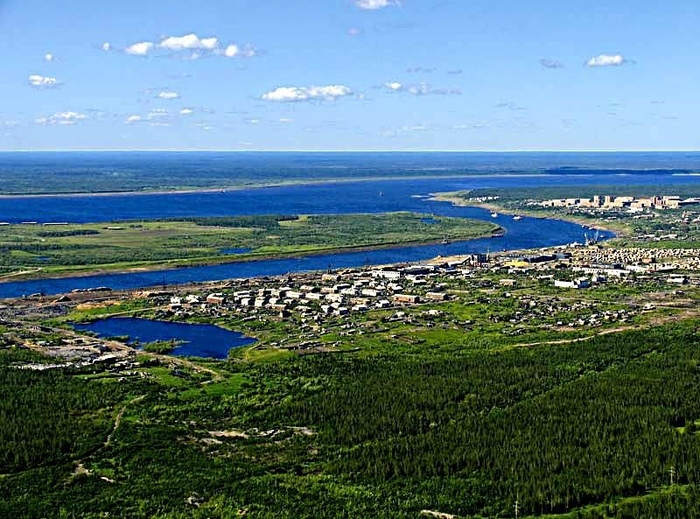 Надо всем Севером вторую неделю стоит огромный антициклон, подаривший нам прекрасный заполярный загар под безоблачным небом и круглосуточными +30 (вот куда ушло московское лето). За неделю путешествия мы увидели, может, с десяток облаков, и одно из них накрыло солнце как раз в тот момент, когда мы подошли к Игарке.