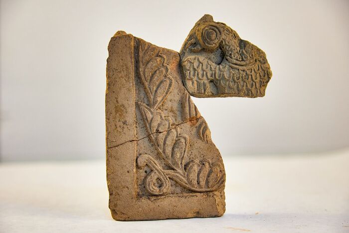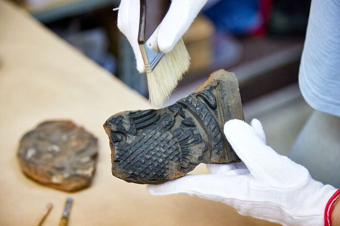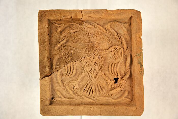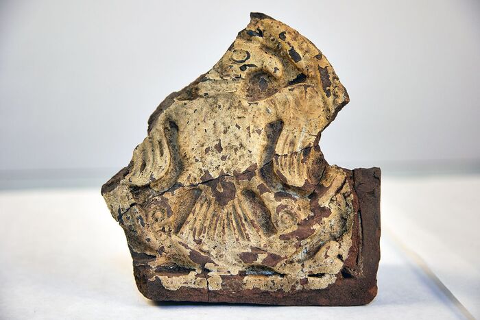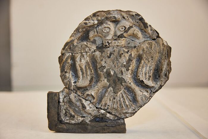В процессе разборки второго камина, который имеет уже гораздо более уверенную пластику рельефа, но по-прежнему покрашен масляной краской, а не глазурью, обнаружились и клейма поинтереснее, подтвердившие предположение о существовании изразцовой мастерской на Валааме: