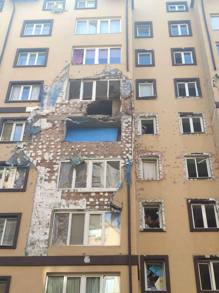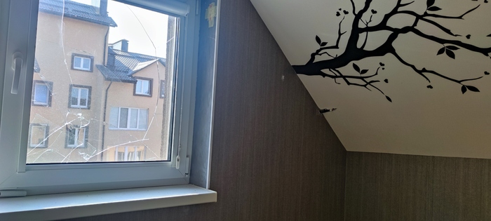 Моей квартире повезло больше, разбитое стекло и сквозное отверстие в стене, вот так это выглядит:
