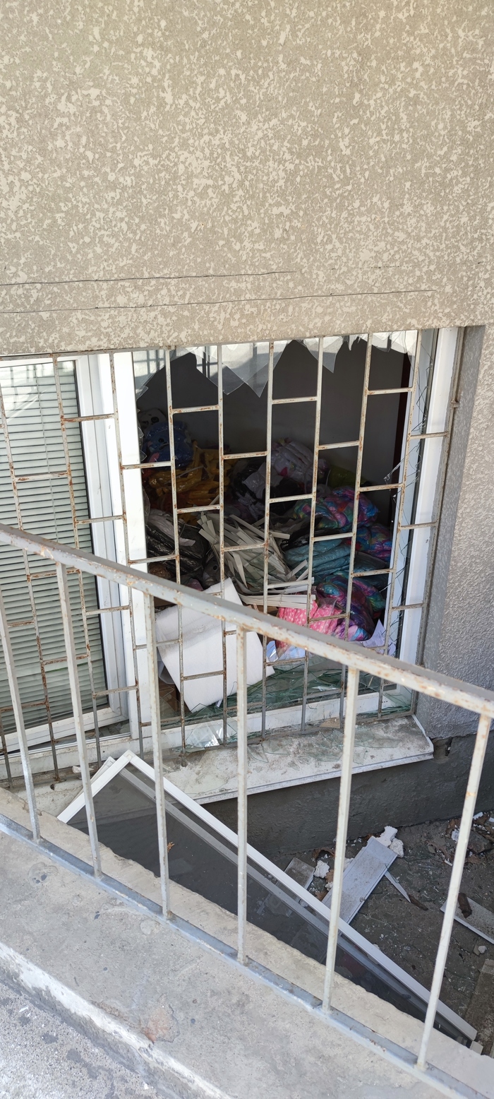 Окна все выбиты, но товар арендатора цел, спасибо решеткам. Мы предусмотрительно захватили с собой пленку чтоб их заклеить, на первое время пойдет: