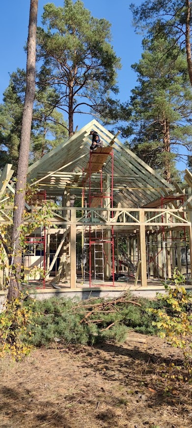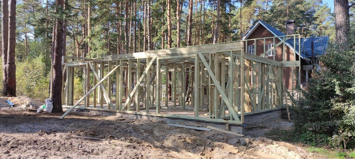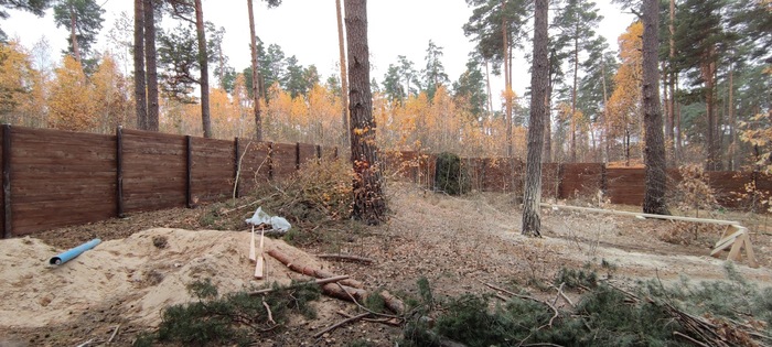 Мы хотели себе каркасный дом в стиле барнхаус, потому нашли подрядчика который обязался все сделать в лучшем виде, подкопили денег для старта стройки и в начале осени приступили к строительству, мы хотели оставить как можно больше целых деревьев на участке, потому спилили по минимуму - одно большое дерево и ветку другого дерева: