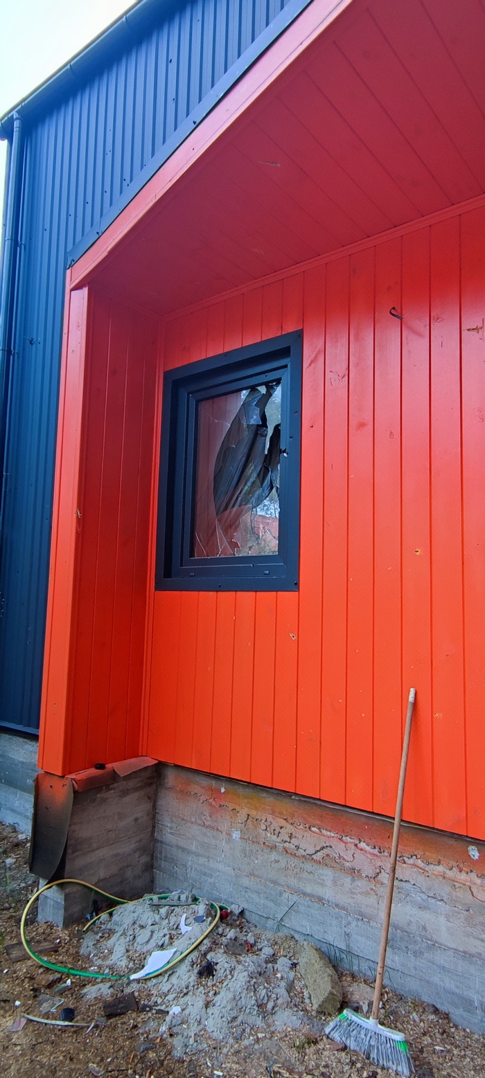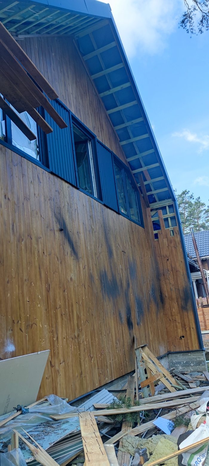 Сам дом расстрелян, странно звучит, но именно так можно описать каркасный дом в который стреляли, куча сквозных отверстий когда пуля входит в одну стену и выходит из другой стены. Окон осталось целых примерно 30%, обидно что много где прострелена рама, т.е. такие окна уже нельзя восстановить, в крыше тоже дырки(фото не сделал, мокрый пол под дыркой в крыше говорит о том что все плохо):