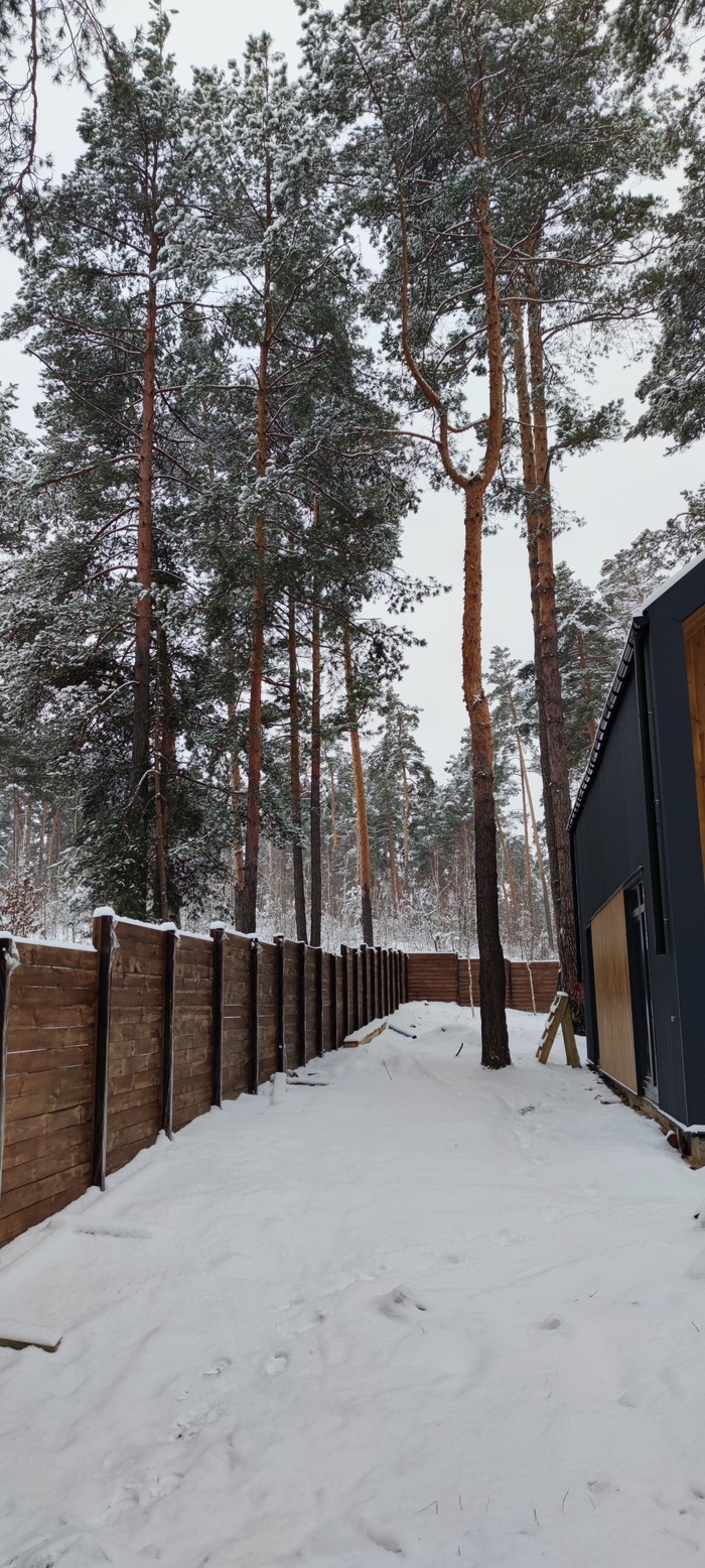 Уже зимой этого года как-то приехал посмотреть как идет стройка и дыхание перехватило, снег лежит, сосны стоят в снегу, красота неимоверная(с женой договорились посадить во дворе голубую ель и наряжать ее на новый год):