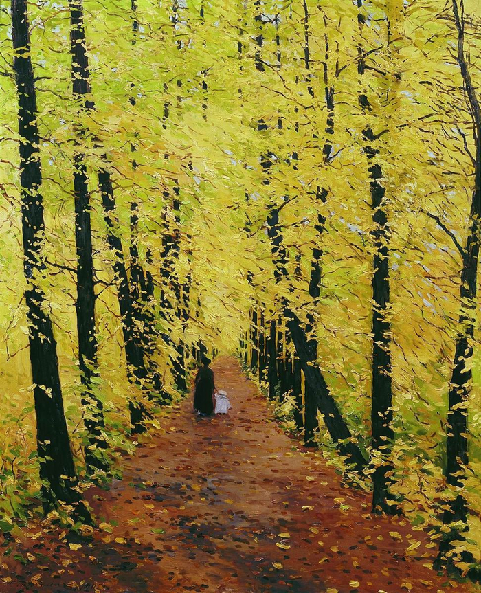 Столица накладывает слои краски как не в себя, но не забывает про баланс –по дорожке бредут женщина с ребёнком, тоже контрастные, они выхватывают взгляд от хаоса природы. Вот по такой осени я бы прогулялся!