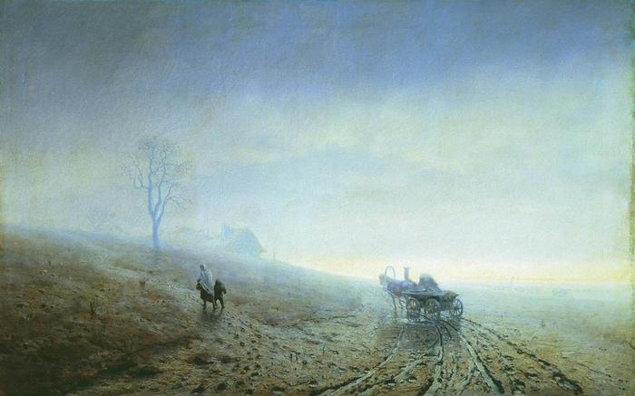 Прыгаем в контрастную работу Архипа Куинджи «Осенняя распутица». О да. Насыщенный туман, везде грязь, раздетые деревья. Такую осень я вижу последнее время. Удивительно, но большой мастер цвета и свечения изобразил одну из самых унылых осенних пейзажей, что я видел.