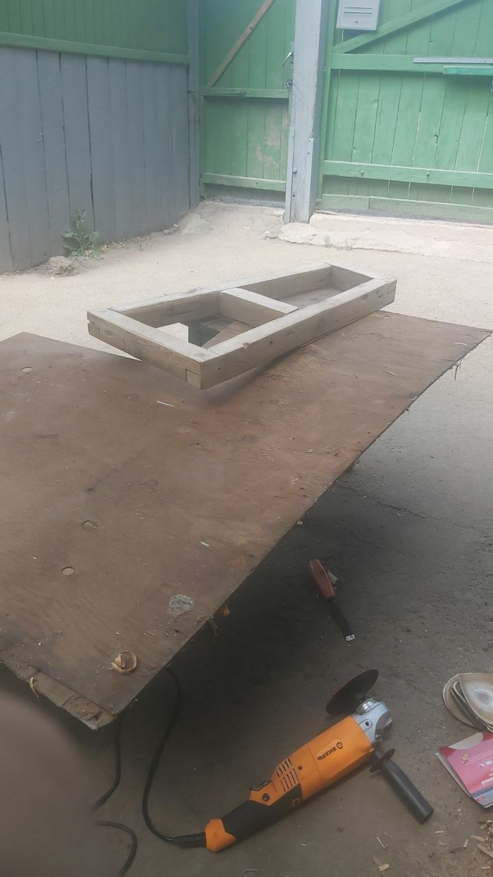 Собирать решил в трапециевидную форму, понравилась больше, чем более часто используемая прямоугольная. Соединение на углах в лапу (хотел в прямую, но получилось в косую), смазал ПВА, забил чопики, обрезал лишнее. Размер заготовки получился 80 см, основание 24 см, верх 42 см.