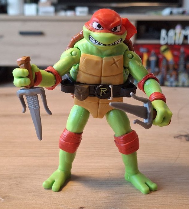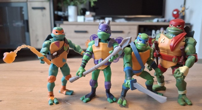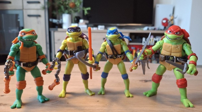 Последний на данный момент комплект фигурок относится к вышедшему в 2023-м году очередному полнометражному мультику. Честно скажу, я от него ничего не ждал и пошёл в кино только для того, чтобы проверить достаточно ли я уже понимаю немецкий язык или я всю дорогу буду сидеть и просто смотреть картинки. На удивление, мне очень понравилась визуальная часть, да, цветовая гамма слегка вырвиглазная, но именно техника рисовки мне очень зашла. Понятно, что там опять сквозила «повесточка», опять была темнокожая Эйприл, а новые враги-мутатнты выглядели, мягко скажем, странновато и диспропорционально, но в целом мульт оставил приятные впечатления. А, ну и моих скудных знаний немецкого вполне хватило, чтобы понять что происходит на экране, из чего можно сделать вывод, что мульт ориентирован на младший школьный возраст. Что касается фигрурок, то они весьма приятные, радует разнообразная мимика и яркие цвета, чем-то они мне даже напомнили черепах из сериала «Новая мутация», возможно банданой у Рафаэля.