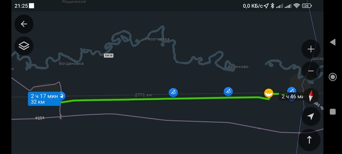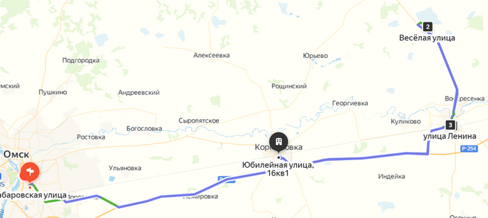 И тут наступила проблемка, товарищ ветер, который весело подгонял меня с утра, когда я был свежим и отдохнувшим, вдруг стал мне не товарищем. А точнее, стал дуть в лицо. Уже при выезде из Калачинска, я понял что так дело не пойдёт, по прямой до самого Омска я не доеду, поэтому решил проехать сначала до Кормиловки, сделать там остановку, отдохнуть и продолжить путь, тем более что, у 2гис появилась новая функция, прокладывание маршрутов для велосипеда. И навигатор подсказал мне "короткую дорогу". Согласитесь, выглядит многообещающе?