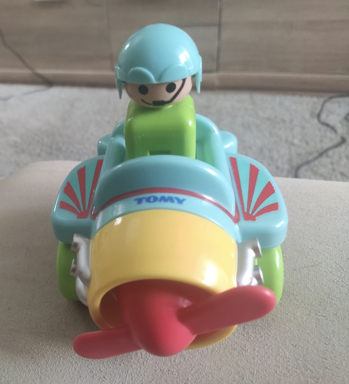Играли с дочкой в её комнате и обнаружил среди кучи пластикового хлама вот такую занятную вещь: внимание! инерционный самолёт с пилотом для 2-4 лет. Я не покупал, видимо, передался через знакомых от ребенка к ребенку.