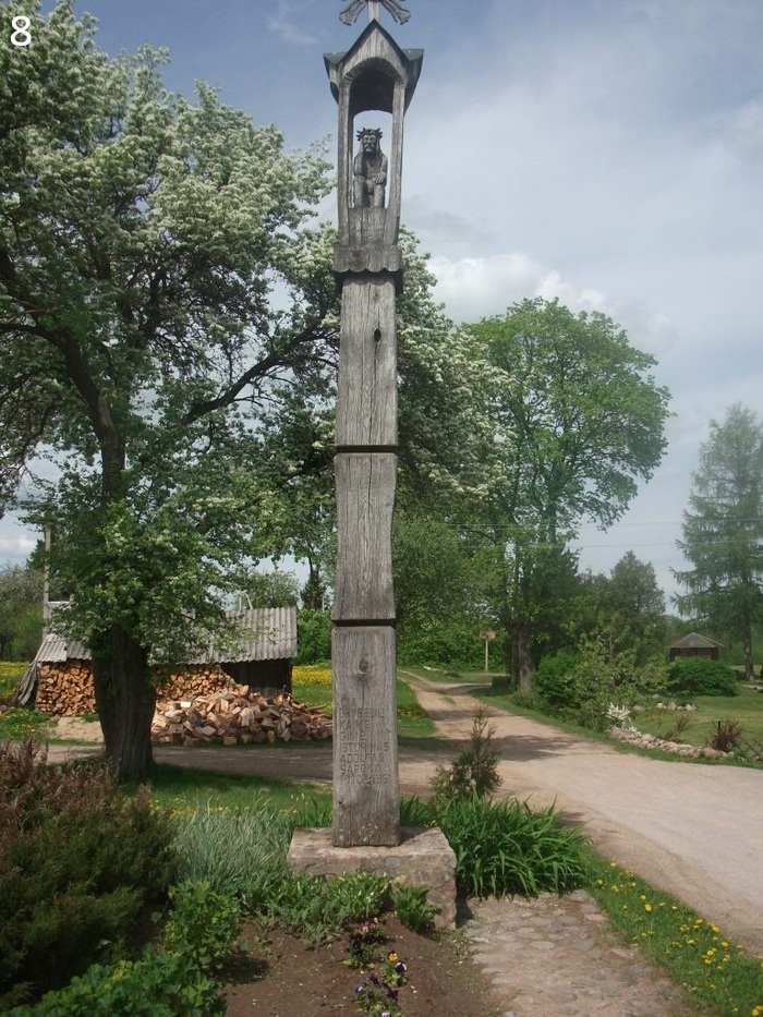 (*) stogastupis ("крыше-ствол") – феномен литовского народного искусства, представляет собой вырезанный из цельного ствола дерева столб, который, как правило, увенчан небольшим "домиком" с "крышей"/навесом, под которой распологается резная скульптура Христа/Богоматери/какого-нибудь святого, все это сопровождается одним или несколькими крестами, часто все это украшено очень причудливыми народными орнаментами. Такие столбы могут поставить в память о каком-то человеке (но не обязательно) во внутренних дворах, на перекрестках дорог и тд.