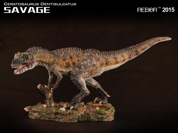 На очереди у нас североамериканский позднемеловой теропод инфраотряда Ceratosauria, который объединяет "тупиковую ветвь" эволюции тероподов, имевших общих предков с тетанурами (аллозавриды, мегалозавриды, спинозавриды, тираннозавриды, рапторы и предки птиц), но отошедшие от позиции доминантных хищников в пользу охоты на мелкую, нишевую и высокоуязвимую жертву, а также поиска падали. Также к "цератозавровым" относятся элафрозавриды (лимузавр), ноазавриды (масиакозавр) и легендарные абелизавриды (карнотоавр). Цератозавр делил охотничьи угодья с Аллозавром и Торвозавром, куда более крупными и сильными хищниками, которые также превосходили их и по численности. Скорее всего цератозавр избегал столкновений с ними, забредая в глубокие леса и заросли и охотился на там же прятавшихся орнитоподов. Также возможно низкое коренастое тело позволяло цератозавру хорошо плавать, что могло делать его рыболовом или как минимум мастером засады на несведующую добычу, пришедшую на водопой. Помимо очевидного рога и надглазных наростов на голове, у цератозавра по всему телу были вторичные кожные окостенения, остеодермы, которые не встречаются у других теропод. Функционал рогов и остеодерм до сих пор оспариваются учёными, но вряд ли они были эффективной системой защиты или нападения. Так или иначе, Rebor передали все физиологические особенности цератозавра, поэтому фактуру модели можно разглядывать часами.